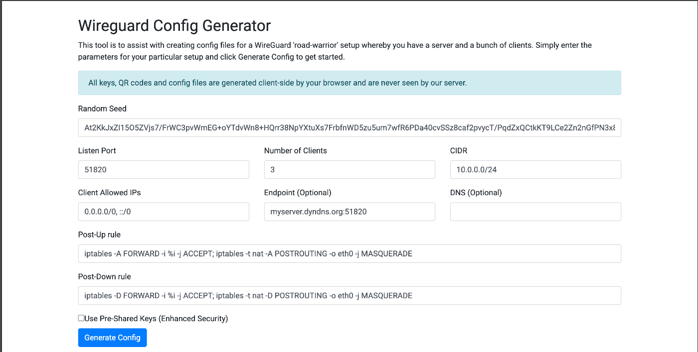 本来であれば自身で設定ファイルの作成と、鍵の作成を行うべきだが、今回はWireGuardの設定ファイル生成ツールを使って生成する。