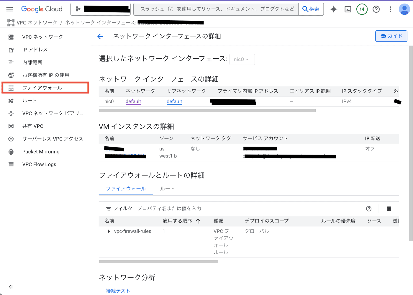 Google Cloud Consoleにログインし、インスタンスに紐づけられているネットワークインターフェイスの設定画面へ。